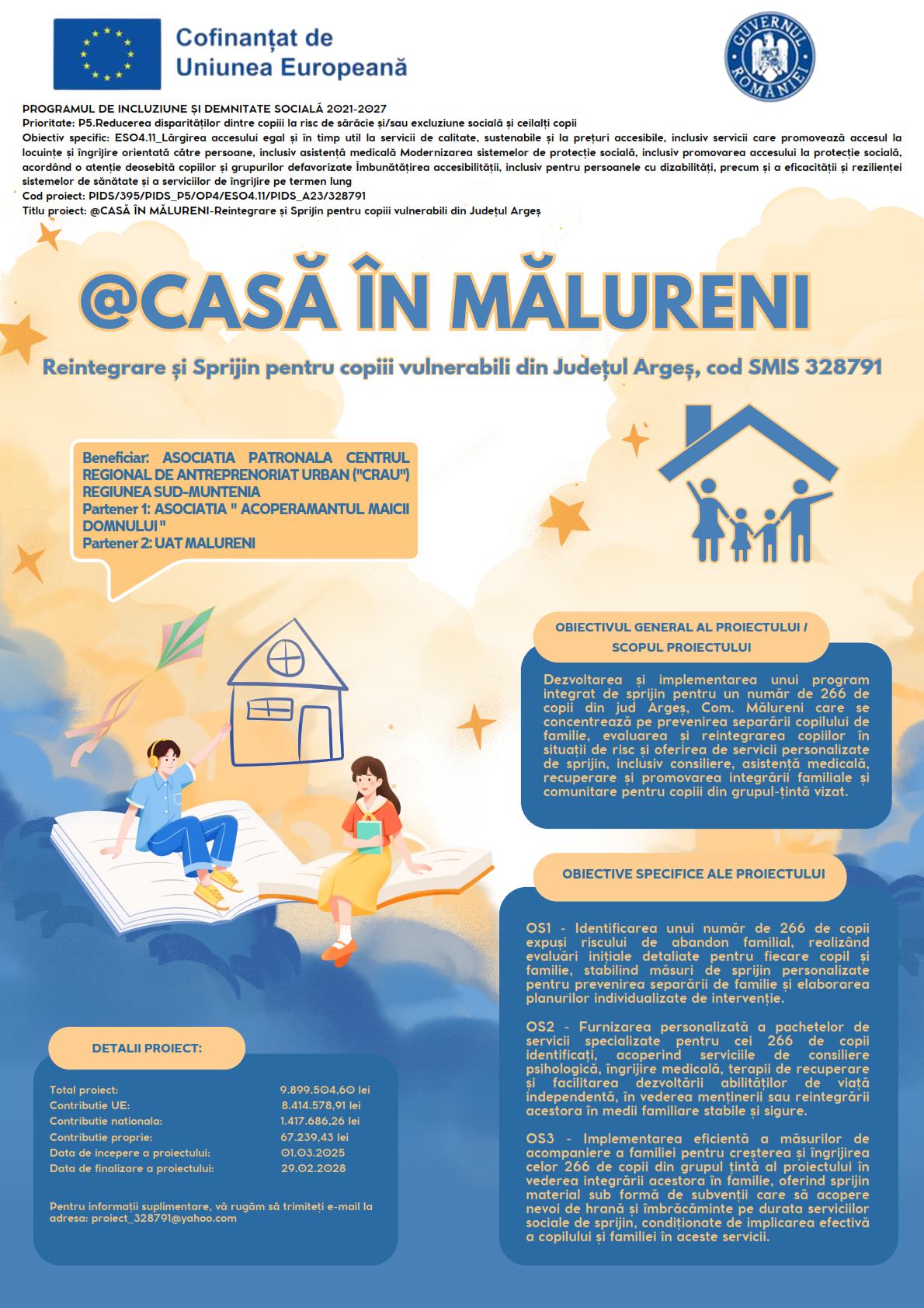 ASOCIATIA PATRONALA CENTRUL REGIONAL DE ANTREPRENORIAT URBAN („CRAU”) REGIUNEA SUD-MUNTENIA în parteneriat cu ASOCIAŢIA ACOPERAMANTUL MAICII DOMNULUI si UAT MALURENI implementează proiectul @CASĂ ÎN MĂLURENI-Reintegrare și Sprijin pentru copiii vulnerabili din Județul Argeș -ID 328791